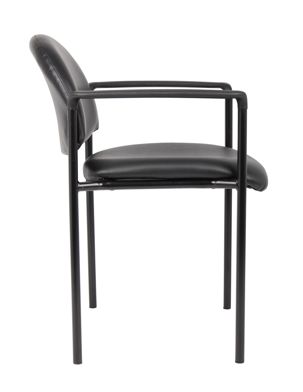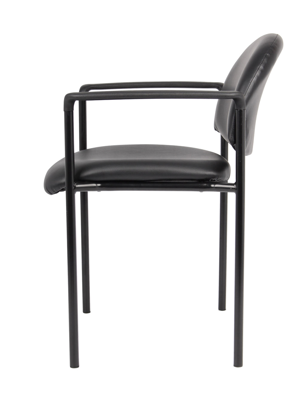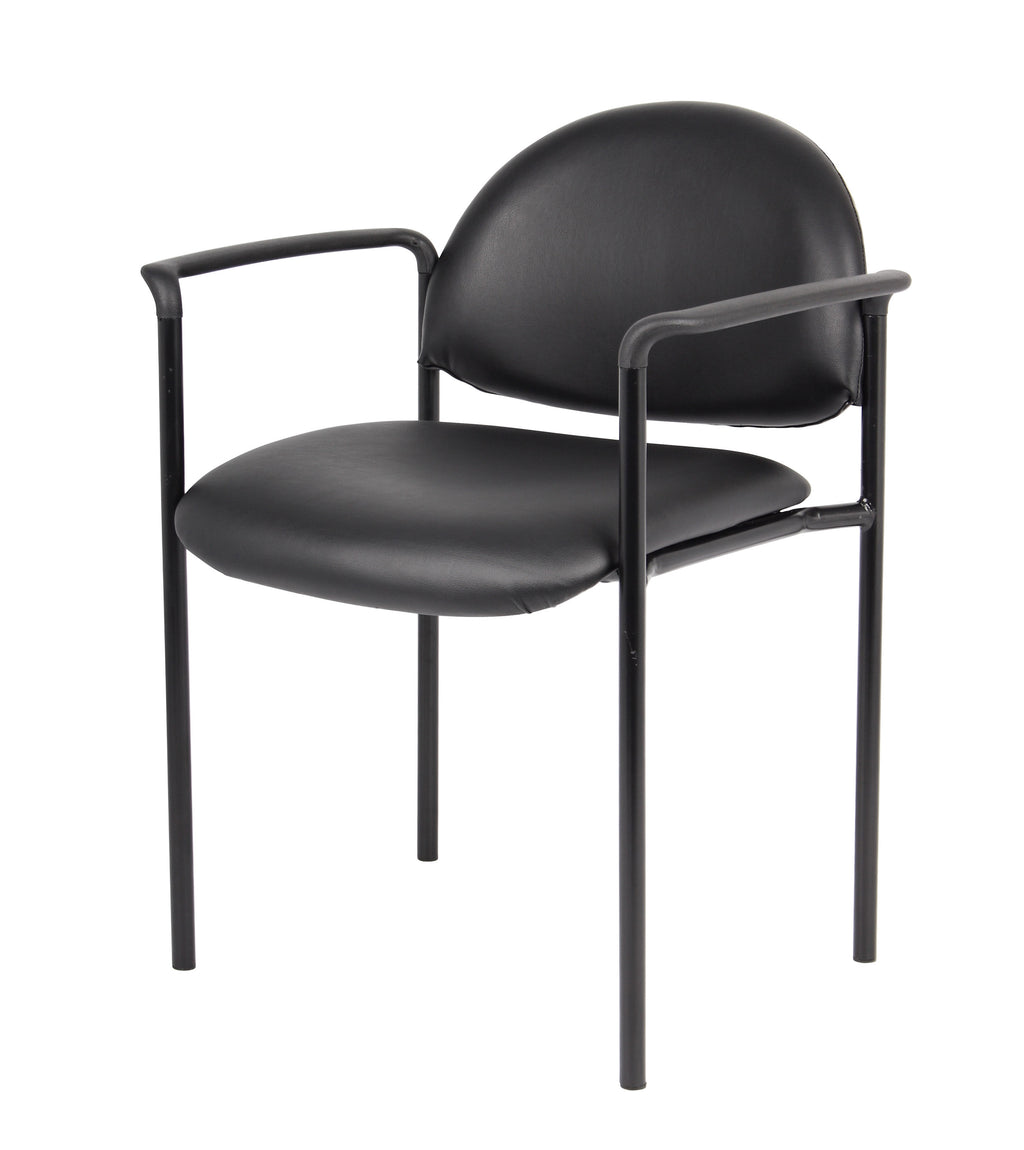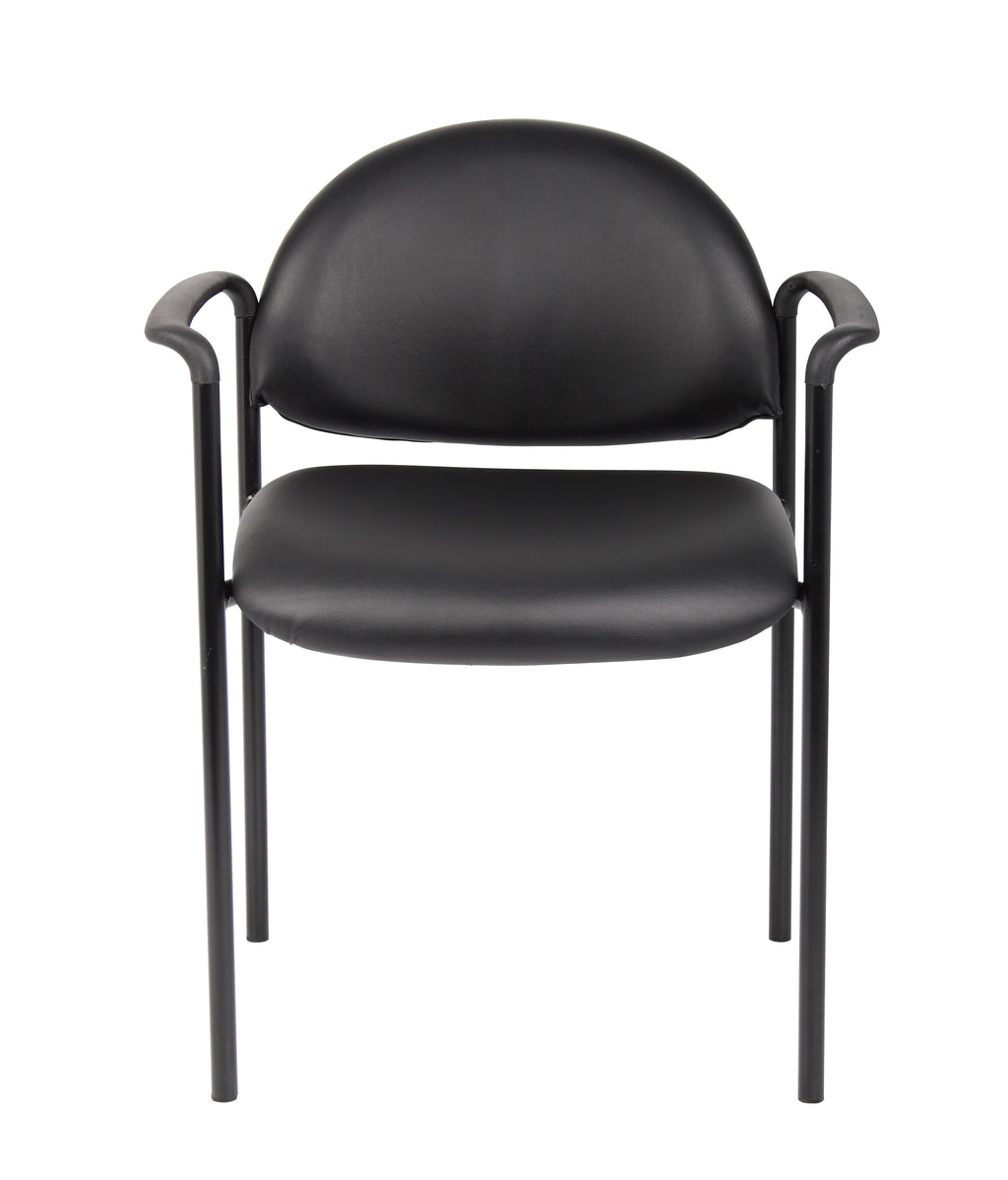 Our stackable chair makes a perfect addition to any office, conference room, lobby, or study. Its contemporary style, powder coated steel frame, and molded arm caps promote comfortable and ergonomic seating, while its 18 pound weight facilitates easy stacking for space-saving storage when necessary. Up to four chairs can be stacked at once. This model features black Caressoft vinyl that is extremely easy to clean, as well as a waterfall seat that helps minimizes leg stress.