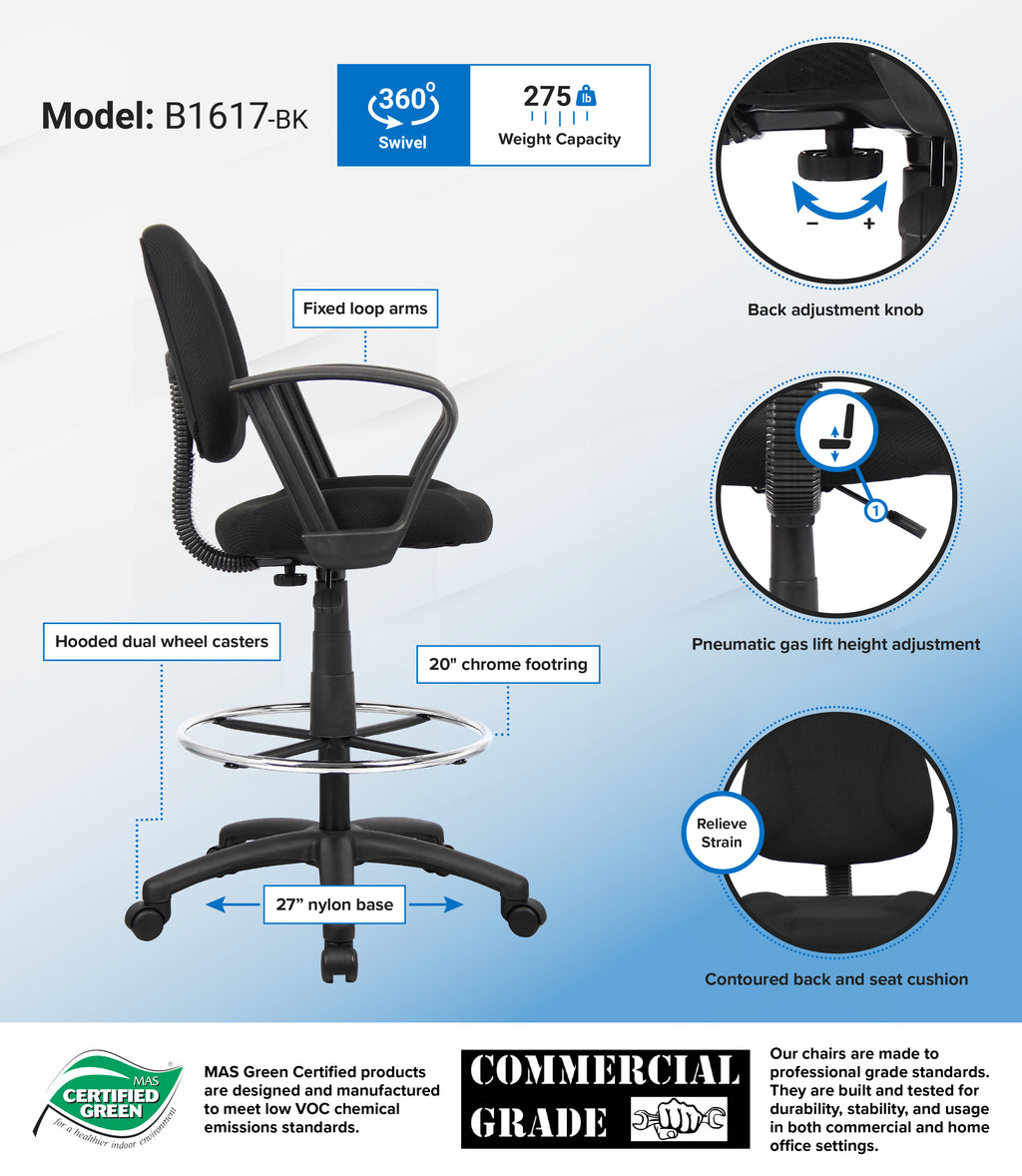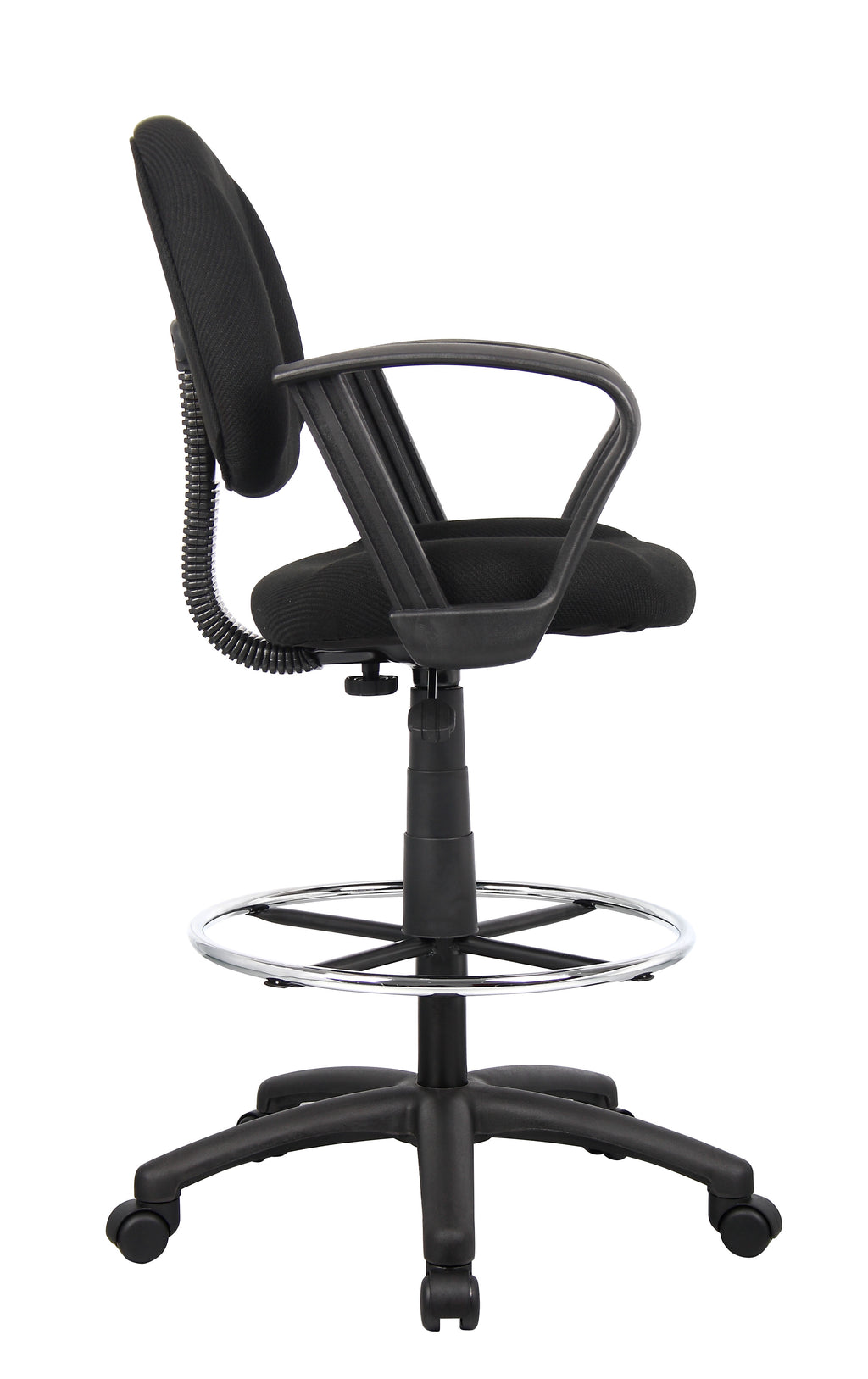 Boss Ergonomic Works Adjustable Drafting Chair with Loop Arms and Removable Foot Rest, Black (B1617-BK) Each