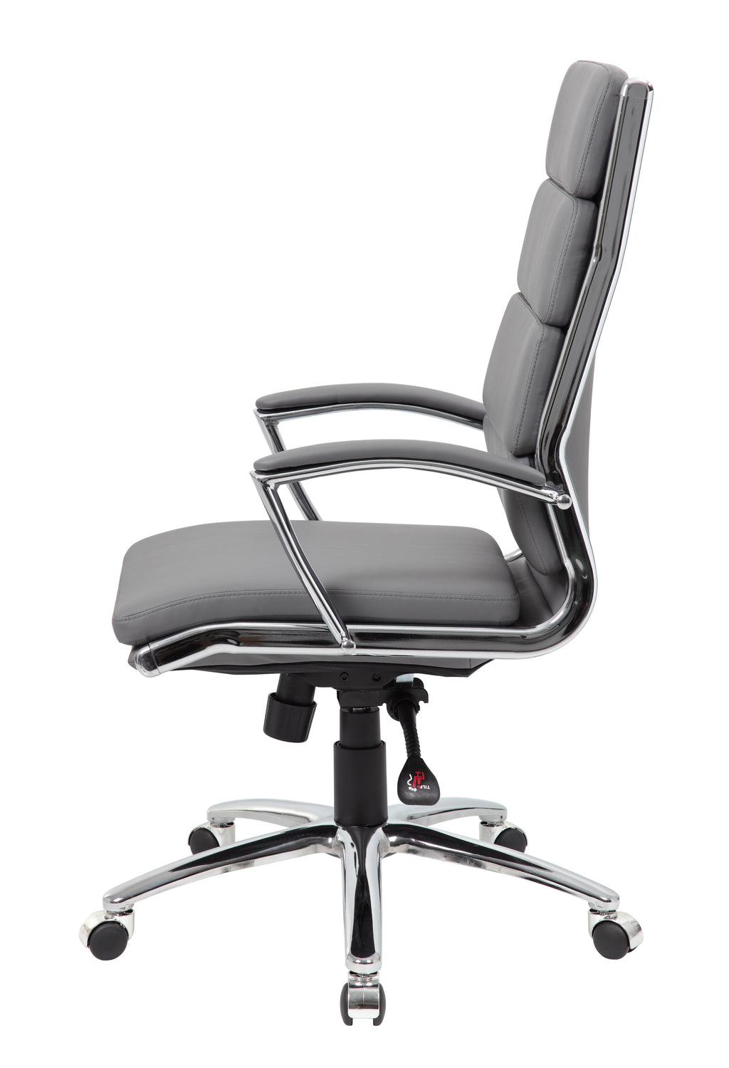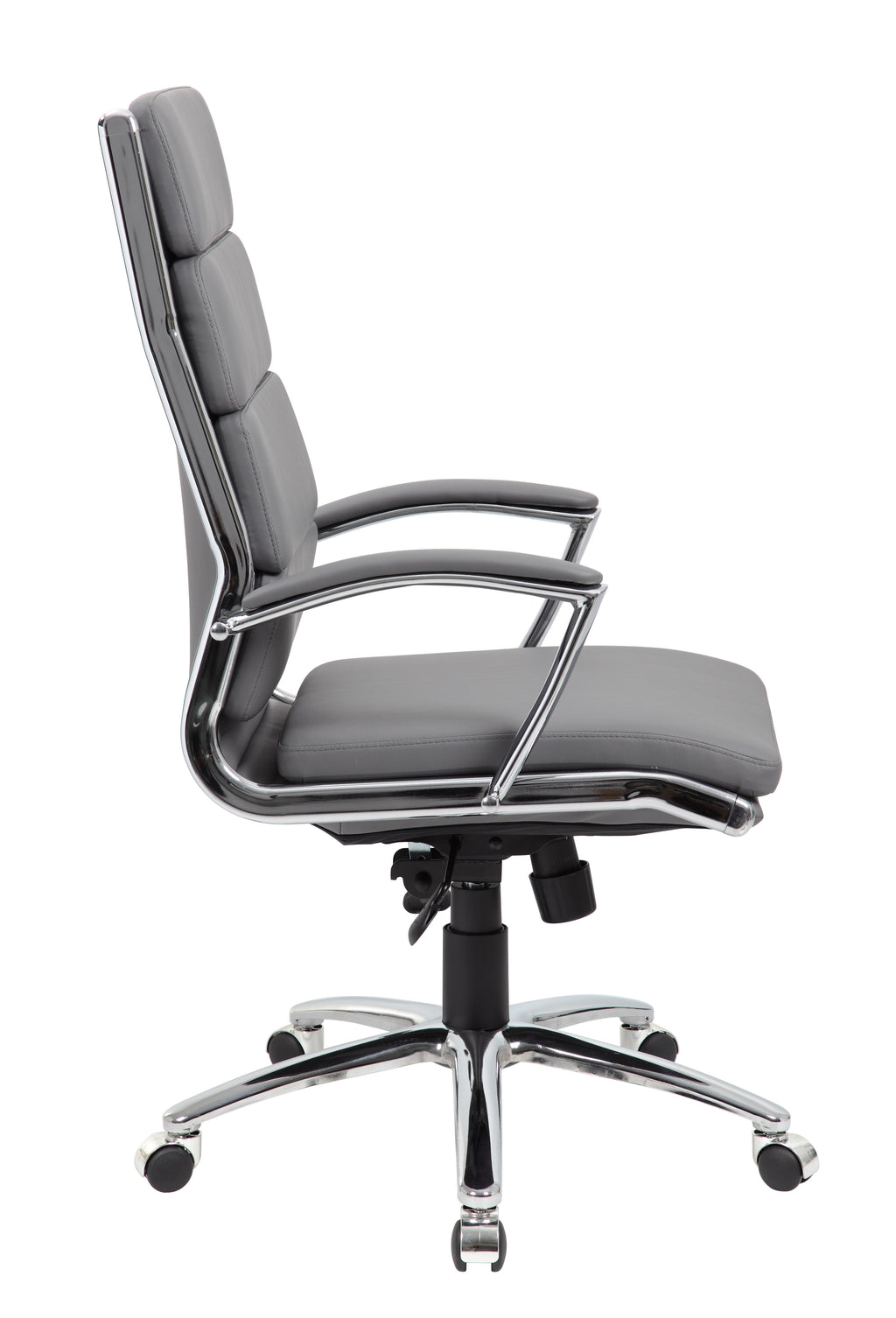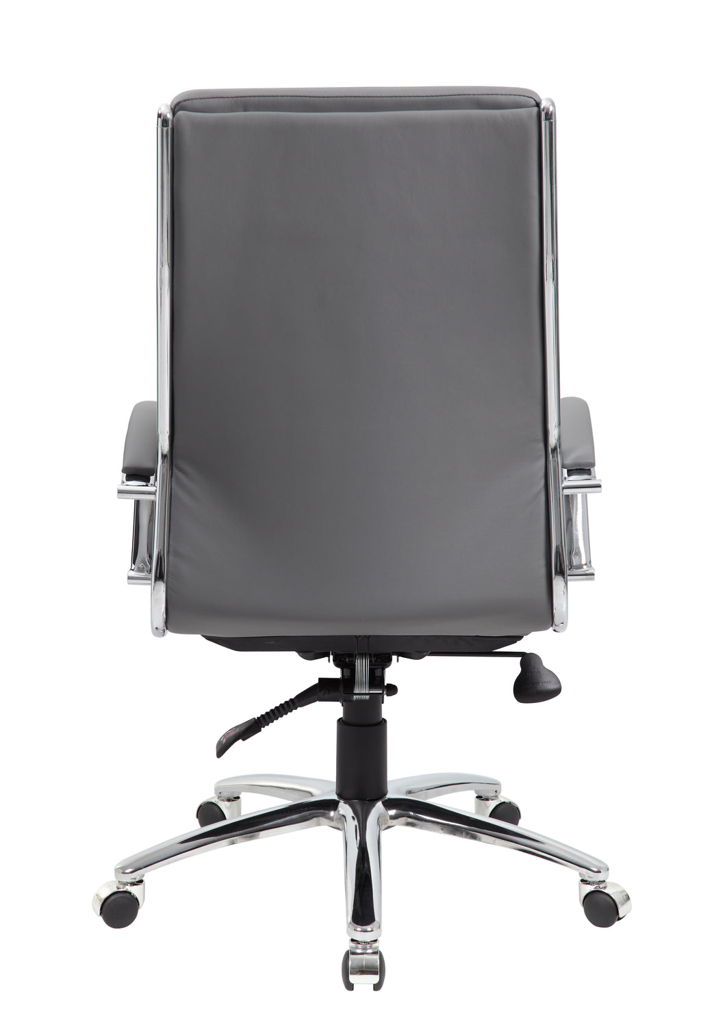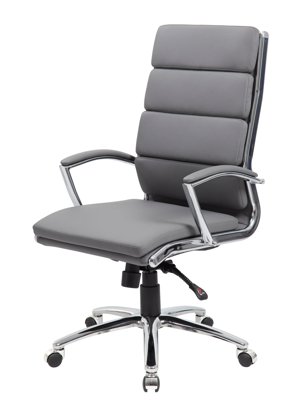The executive CaressoftPlus chair in grey with the metal chrome finish is as comfortable as it is handsome. The chair utilizes a two paddle mechanism which designates one paddle for lift and one paddle to release spring tilt or lock; it is very heavy duty. The chair is made with a material called CaressoftPlus which is a trademarked vinyl that is an ultra-soft upholstery that looks & feels like leather, but more durable & easy to clean. The chair also offers tilt tension, a pneumatic gas lift and an upright lock. It has been designed with a sturdy 27 inch chrome base with 2 inch nylon dual castor wheels and has a weight capacity of 275 lbs.