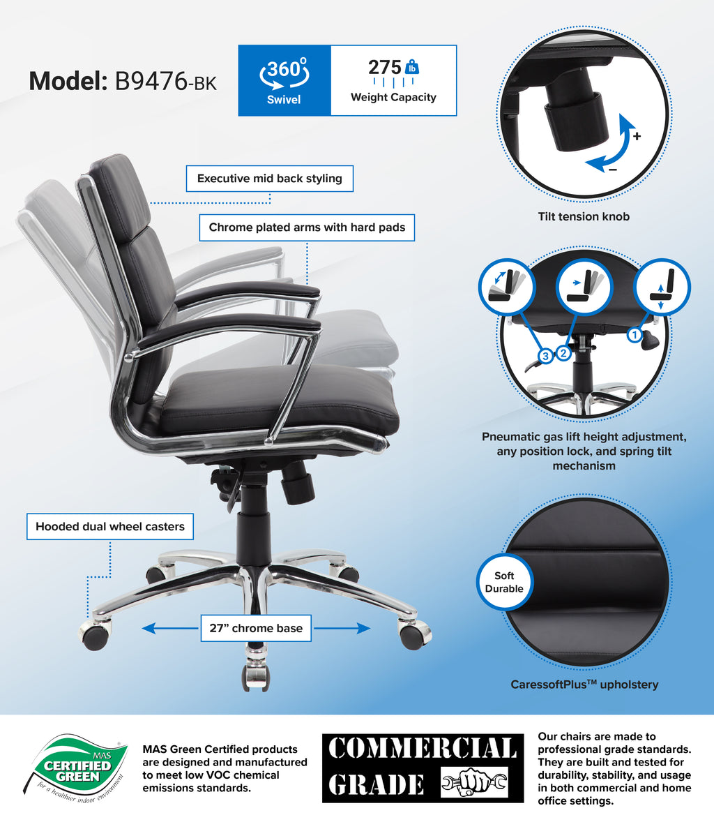 The mid-back executive CaressoftPlus chair in black with the metal chrome finish is as comfortable as it is handsome. The chair utilizes a two paddle mechanism which designates one paddle for lift and one paddle to release spring tilt or lock; it is very heavy duty. The chair is made with a material called CaressoftPlus which is a trademarked vinyl that is an ultra-soft upholstery that looks & feels like leather, but more durable & easy to clean. The chair also offers tilt tension, a pneumatic gas lift and an upright lock. It has been designed with a sturdy 27 inch chrome base with 2 inch nylon dual castor wheels and has a weight capacity of 275 lbs.