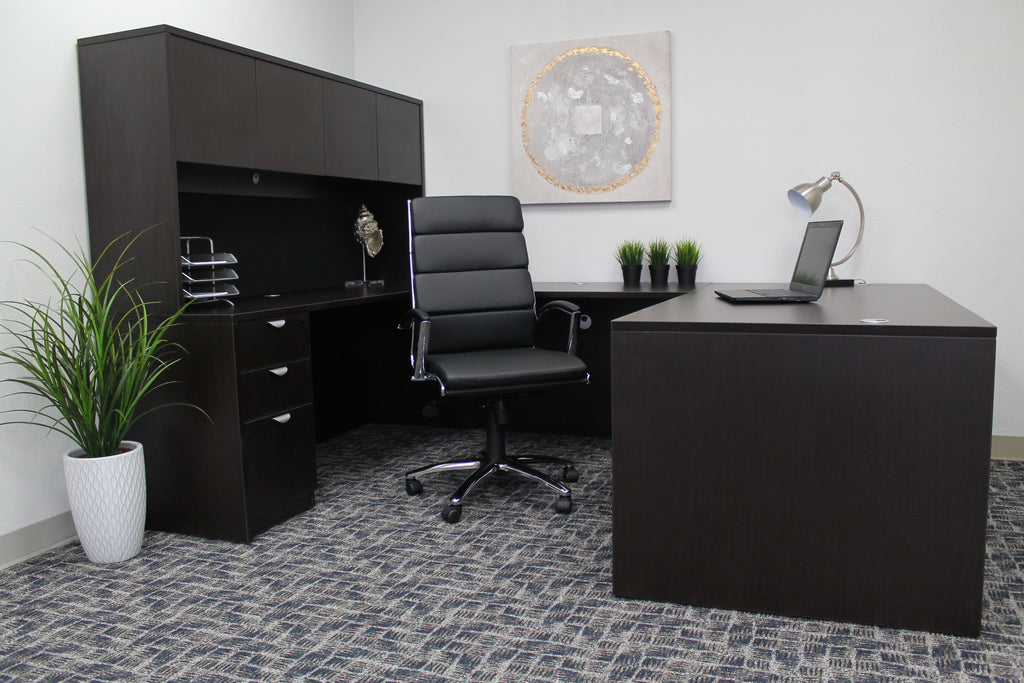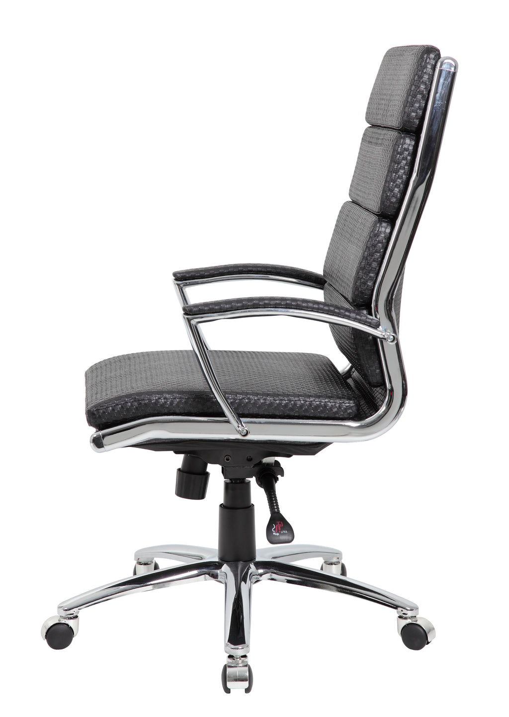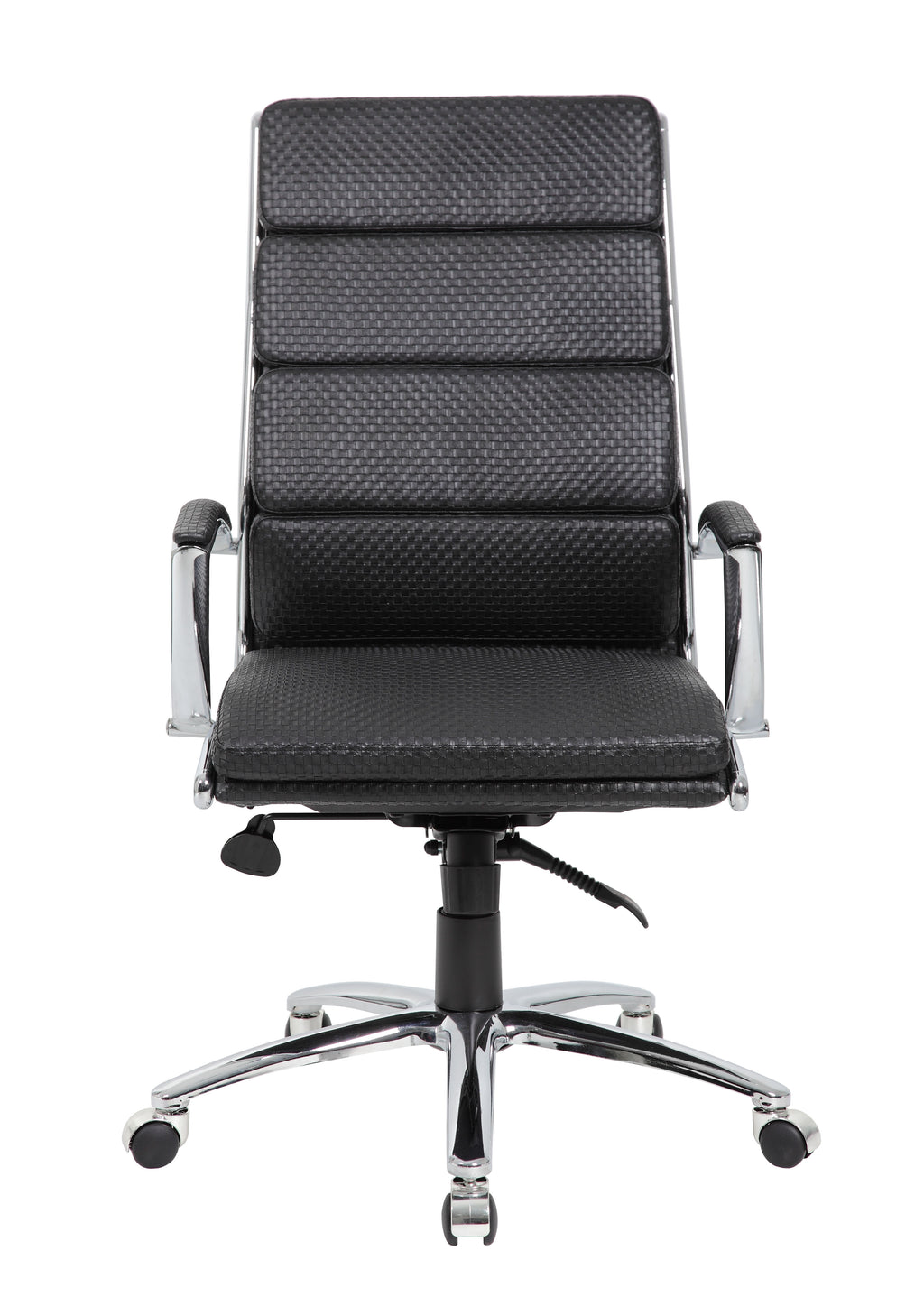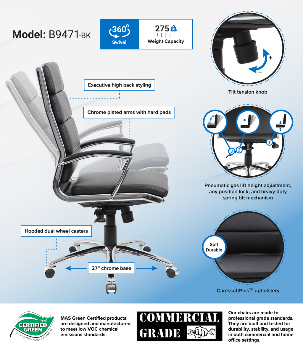The executive CaressoftPlus chair in black with the metal chrome finish is as comfortable as it is handsome. The chair utilizes a two paddle mechanism which designates one paddle for lift and one paddle to release spring tilt or lock; it is very heavy duty. The chair is made with a material called CaressoftPlus which is a trademarked vinyl that is an ultra-soft upholstery that looks & feels like leather, but more durable & easy to clean. The chair also offers tilt tension, a pneumatic gas lift and an upright lock. It has been designed with a sturdy 27 inch chrome base with 2 inch nylon dual castor wheels and has a weight capacity of 275 lbs.