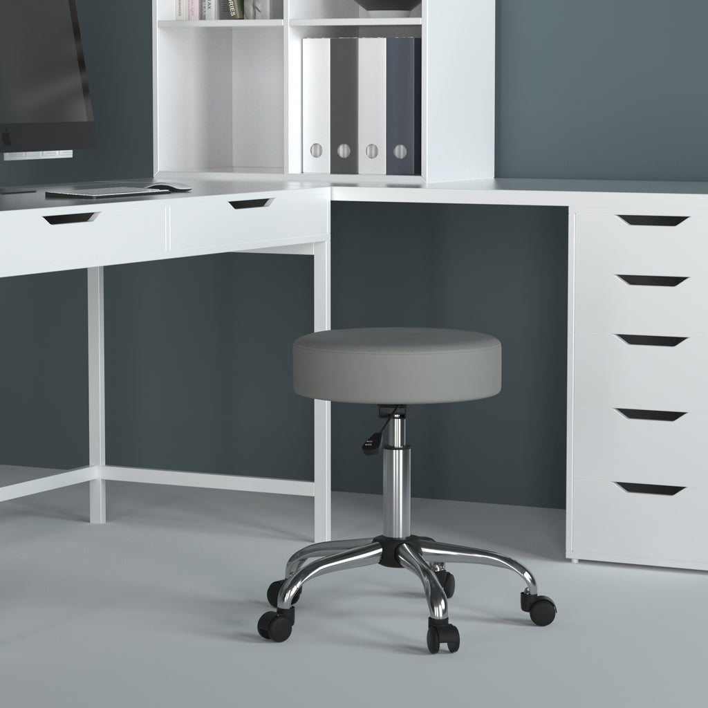 This medical stool is upholstered in durable Grey, easy to clean antimicrobial vinyl, and equipped with a 4� thick molded foam seat that provides improved durability. It is attached with an easy to reach gas lift seat height adjustment lever, providing a vertical range of 6� to suit your comfort and work environment. Its base has an attractive chrome finish, and provides great stability to the stool. The hooded double wheel casters make it easy to move and shift directions.