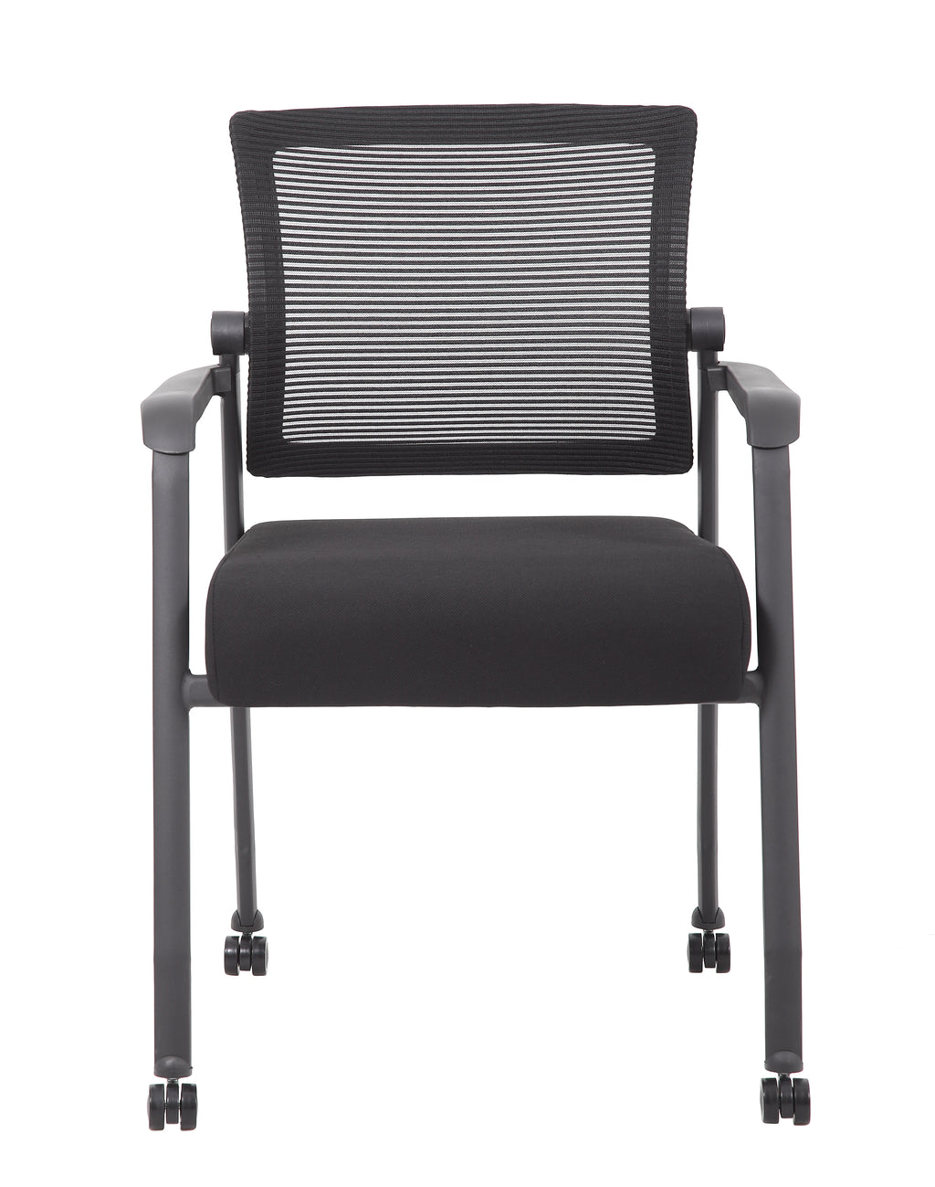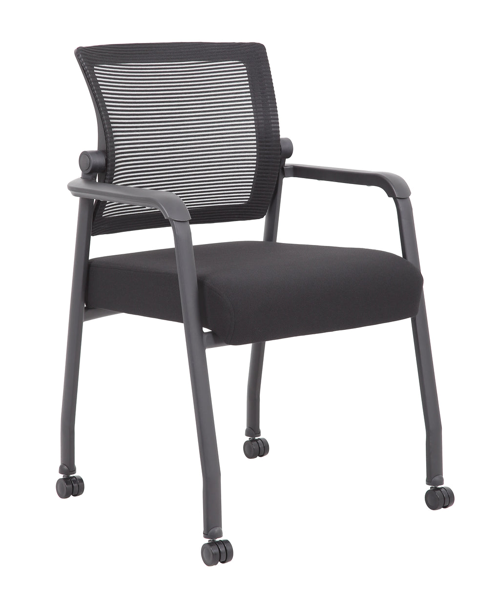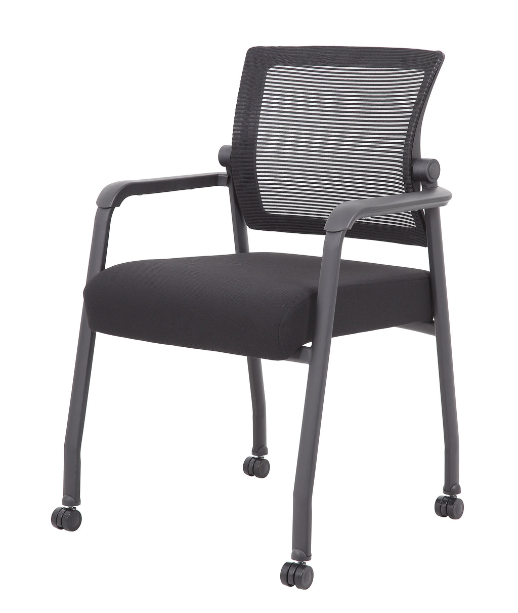 The mesh guest chair with casters, in black, is the perfect addition to any room or office. The chair is at a fixed height with fixed arms and is designed with an upholstered seat and a breathable, airy mesh back. It has a steel tubular frame with hooded double wheel casters that allow smooth movement across many flooring surfaces. The black chair adds a modern, professional appearance to any space and has a weight limit of 275 lbs.