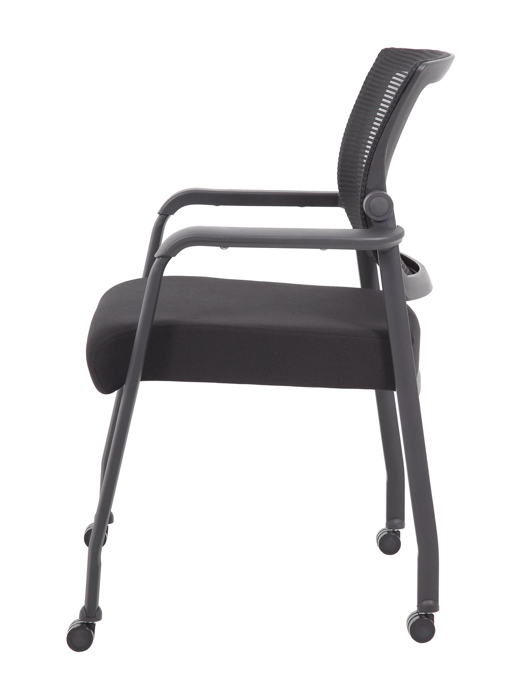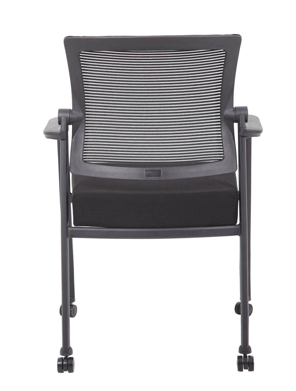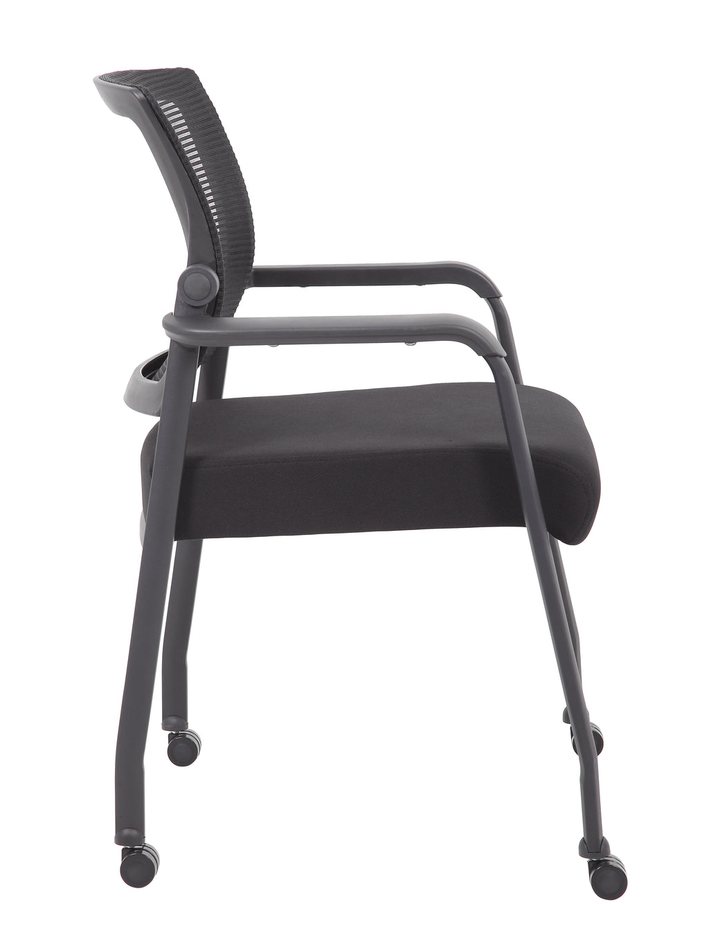 The mesh guest chair with casters, in black, is the perfect addition to any room or office. The chair is at a fixed height with fixed arms and is designed with an upholstered seat and a breathable, airy mesh back. It has a steel tubular frame with hooded double wheel casters that allow smooth movement across many flooring surfaces. The black chair adds a modern, professional appearance to any space and has a weight limit of 275 lbs.