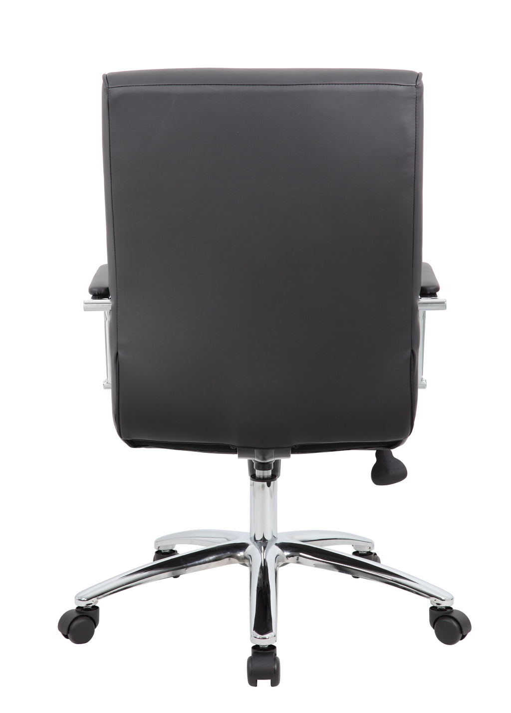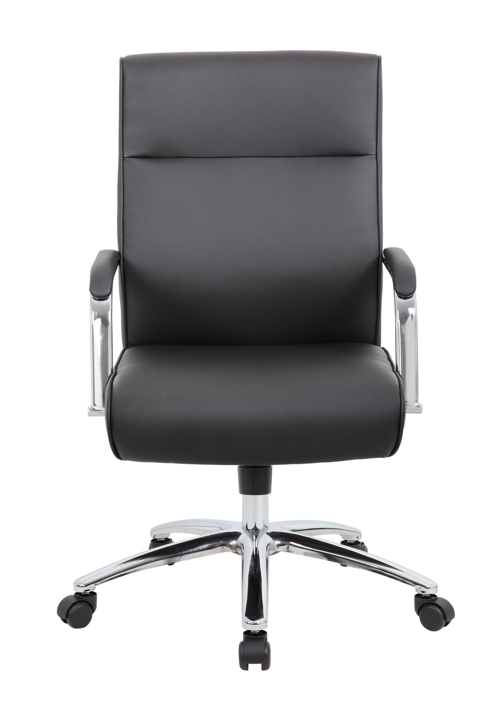 The Modern Executive Conference Chair in black is a fine looking chair made with high quality CaressoftPlus vinyl. CaressoftPlus is a trademarked, ultra-soft upholstery that looks & feels like leather, but more durable & easy to clean. The chair also features a spring tilt mechanism that allows one to change the angle of the entire seat relative to the floor and allows one to transfer some of the upper body weight to the backrest of the chair. In addition to this the chair also boasts a sturdy 27 inch chrome base with 2 inch nylon dual wheel castors and a 275 lbs. weight capacity.