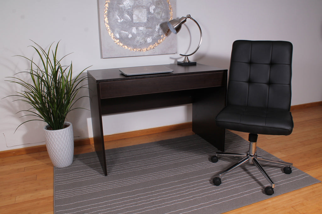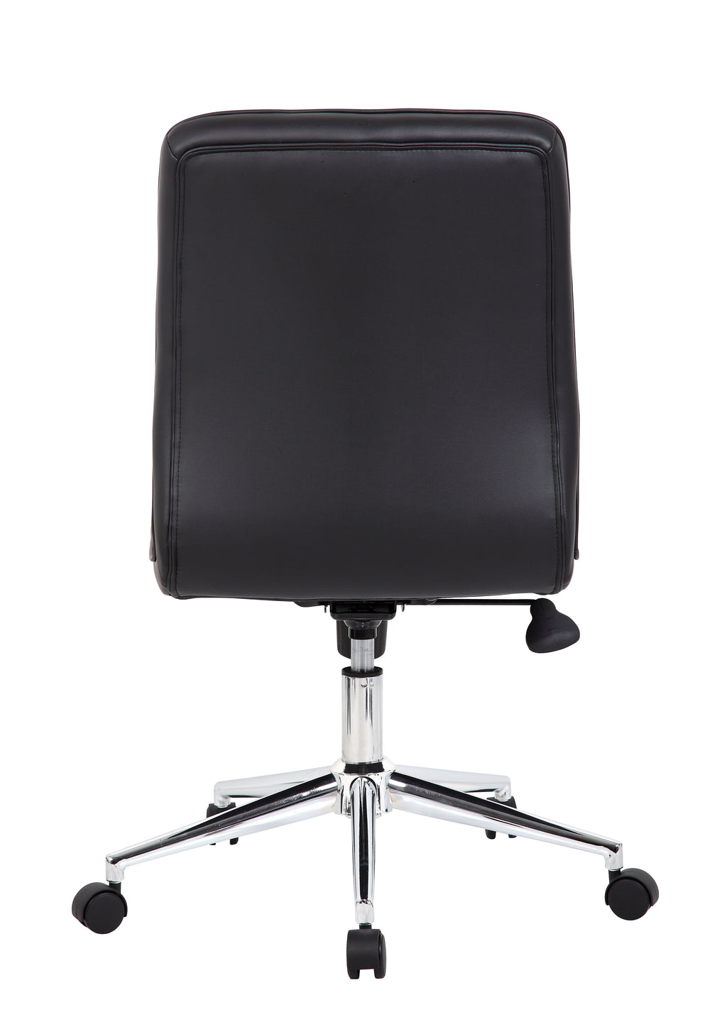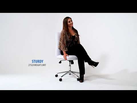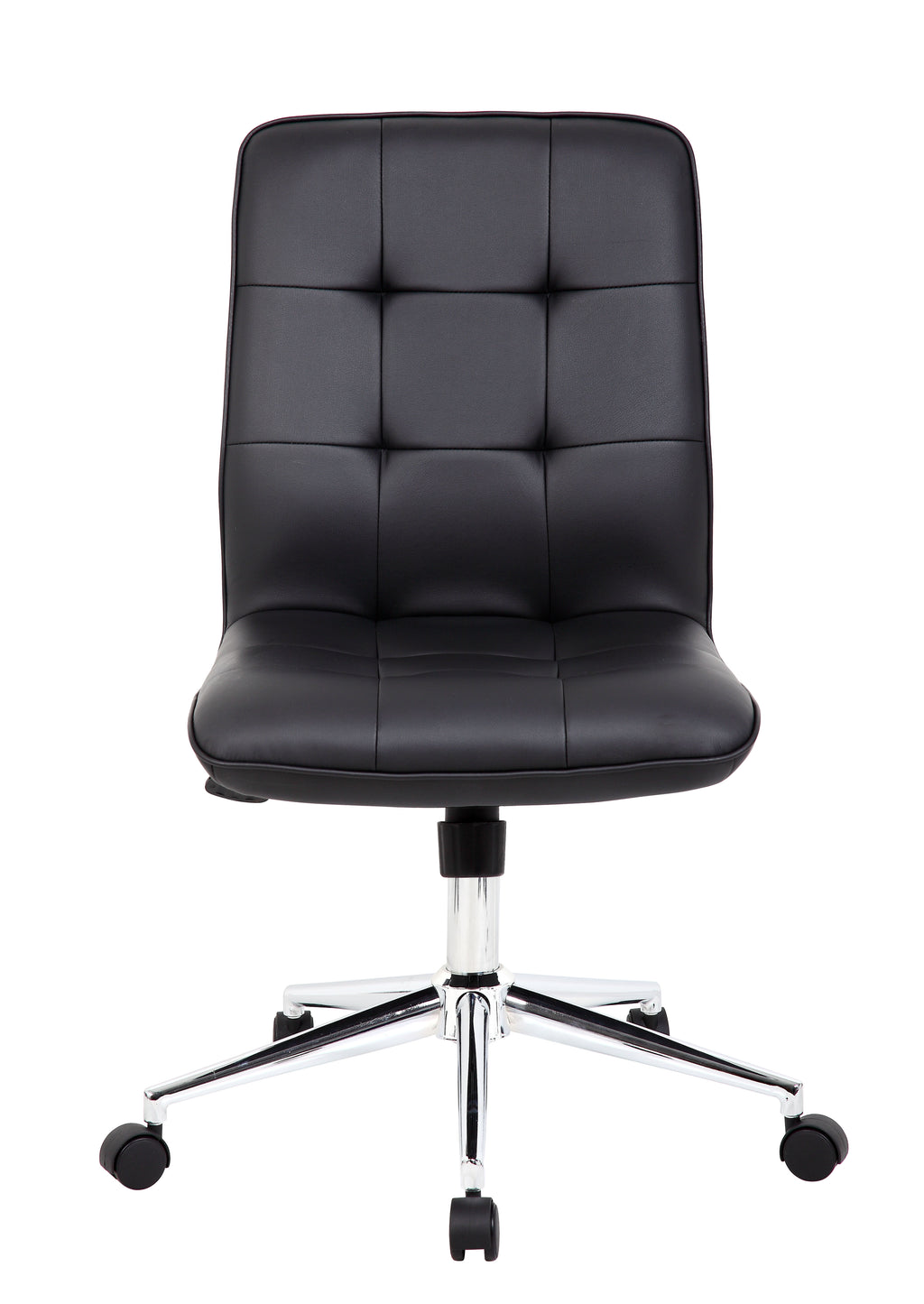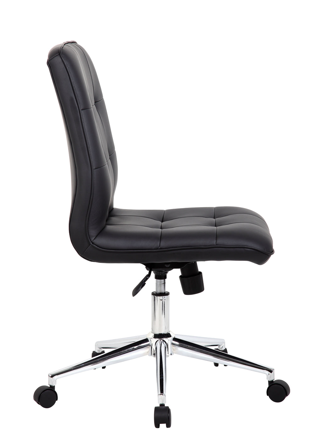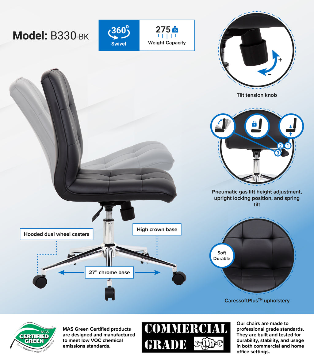 The Millennial Modern Home Office Chair in black is made with CaressoftPlus material. CaressoftPlus is a trademarked vinyl that is an ultra-soft upholstery that looks & feels like leather, but more durable & easy to clean. The 27 inch chair base is designed with fancy high crown chrome and has 2 inch nylon dual wheel castors for smooth rolling. The chair has a 275 lbs. weight limit in addition to offering tilt tension, a pneumatic gas lift and an upright lock.