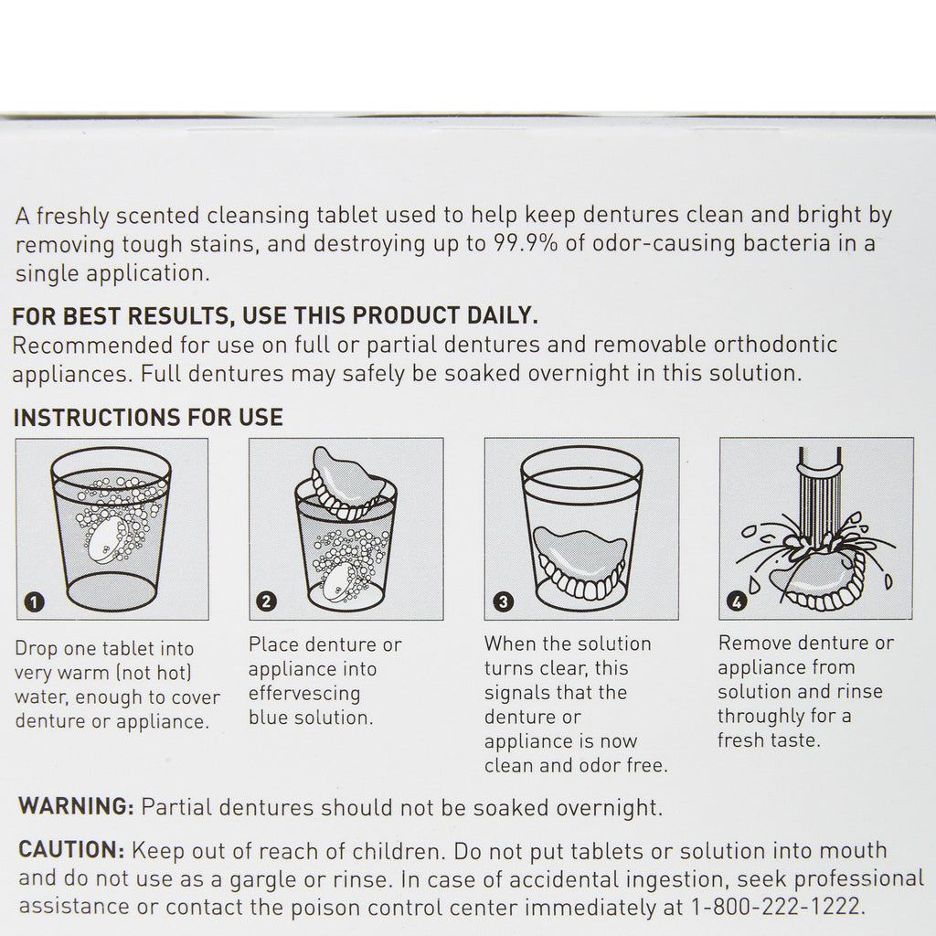 • A freshly scented cleansing tablet used to help keep dentures clean and bright by removing tough stains, and destroying up to 99.9% of odor-causing bacteria in a single application