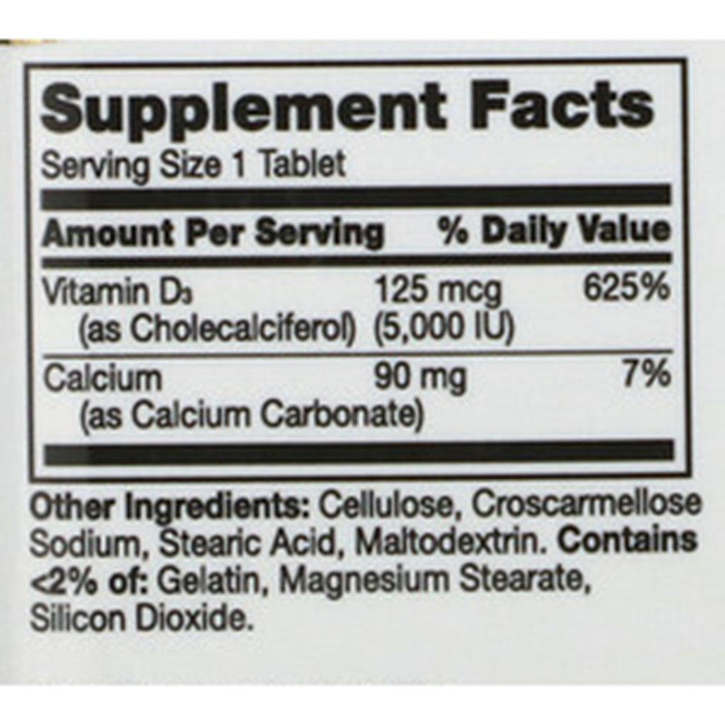- One tablet contains 5,000 IU of vitamin D-3 (as cholecalciferol) and 90 milligrams of calcium (from calcium carbonate)