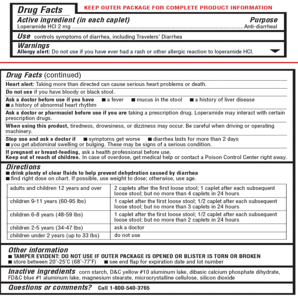 - 2 milligrams of loperamide HCl per caplet controls symptoms of diarrhea, including travelers' diarrhea