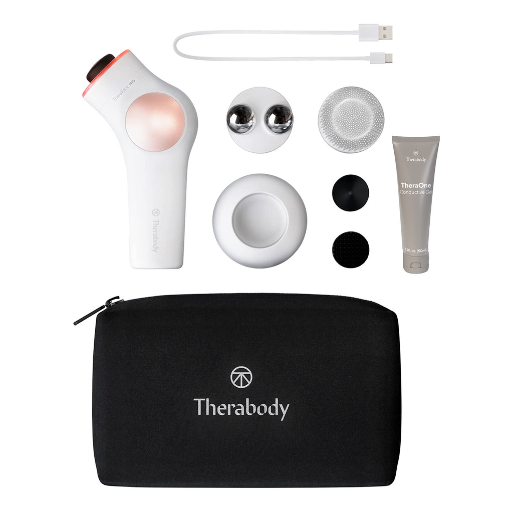 • Included with Theraface device are Percussive Therapy attachments which relieve tension in face, jaw, neck, and head and reduce minor facial muscle pain; Microcurrent Ring which tightens skin and improves muscle tone in face/neck; Red Light Therapy LED Light Ring which helps reduce wrinkles around the eyes; Blue Light Therapy LED Light Ring which helps reduce mild to moderate acne; Red+Infrared Light Therapy LED Light Ring helps reduce wrinkles around the eyes; cleansing ring which removes buildup of dirt, oil and debris.