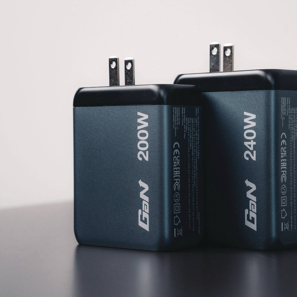 Gallium Nitride (GaN) technology delivers highpowered, fast, efficient charging, generates less heat and allows for smaller and lighter chargers, making them ultraportable. The GNC-240 charger is made with high-quality, flameresistant materials and features four safety protection systems to ensure your safety while charging.